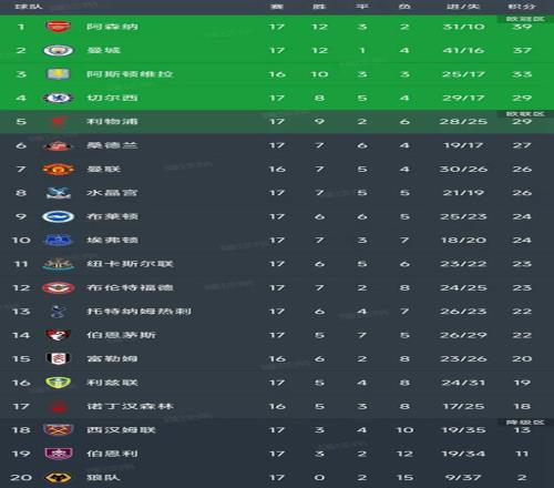 北京時間12月21日,英超第17輪結束了8場比賽,最新積分榜如下!