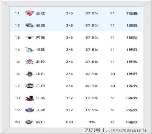 ⑤、新賽季8連敗的四川男籃仍然難嘗一勝,排名墊底,天津隊和江蘇隊同為1勝7負,排名倒數二三位。