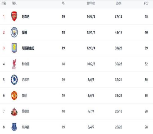 在積分榜上,阿森納總積分達到45分,排名第1。曼城以40分排名第2,落后了5分。不過,曼城少賽一場。阿斯頓維拉依然是39分,排名第3,爭冠形勢惡化了。利物浦以32分排名第4。第5的是切爾西,拿到30分。曼聯也是30分,排名第6。桑德蘭和埃弗頓都是28分。紐卡斯爾聯只拿到26分,排名第10。熱刺只有25分,排名第13。