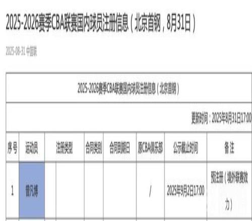 北京時間今日,CBA官網的注冊信息顯示,曾凡博已經在北京北汽的注冊名單中。