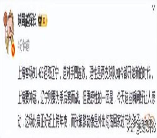 媒體人“趙探長”發(fā)文點評:“理性是兩支球隊如今都開始新的時代,上海要沖冠,遼寧則要為季后賽而戰(zhàn)。但更感性的一面是,今天這些瞬間好讓人感動,這場比賽正好趕上跨年夜,而張鎮(zhèn)麟就像是外出闖蕩回家過節(jié)的孩子?!?/p>