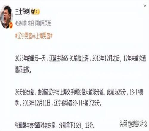 媒體人“三土帶刺”發(fā)文點評:“2025年的最后一天,遼籃主場65-91輸給上海,2013年12月之后、12年來首次遭遇四連敗?!?/p>