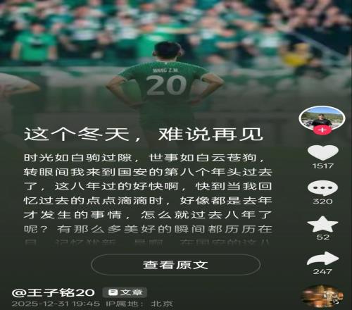同樣發文告別的還有北京國安的王子銘。王子銘在告別中表示,自己非常榮幸和滿足在國安收獲的諸多感動,表示無論在哪都會關注和支持國安。