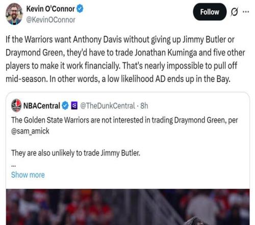 名記Kevin O'Connor表示勇士隊(duì)很難得到濃眉哥,因?yàn)樗麄儾幌胨统霭吞乩栈蛘咦穳?mèng),那么想要圍繞庫(kù)明加追求濃眉哥,勇士隊(duì)需要搭上至少另外5名球員才能配平薪資,這在賽季中期幾乎是不可能完成的操作。