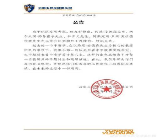出于球隊發(fā)展考慮,經(jīng)友好協(xié)商,約恩·安德森先生、沃爾夫?qū)ぢ芬兹麪栂壬?、和正元先生、阿萊克斯·羅斯·克拉德拉斯先生在工作合同到期后不再續(xù)約。特此公告。