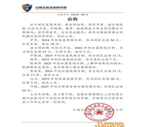 北京時間1月1日,中超聯賽最新動態,上賽季取得聯賽第8名的云南玉昆官宣,主教練合同到期后離任,同時8名球員離隊,而球隊新任主教練則早已敲定。